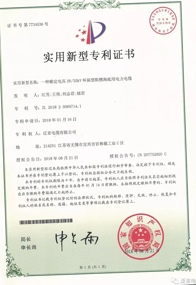 泛亚电缆获得“一种额定电压26-35kV 环保型阻燃海底用电力电缆”专利