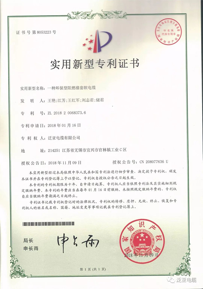 泛亚电缆获得“一种环保型阻燃橡套软电缆”专利